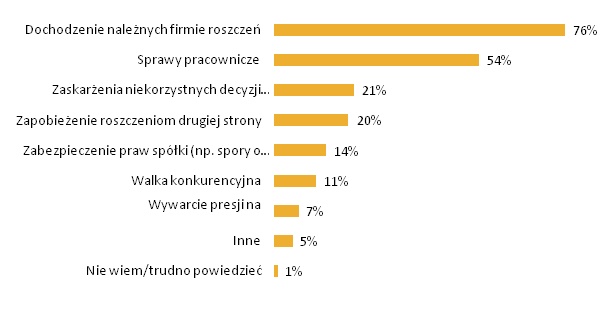 Z kolei liczba wytaczanych przez ankietowane firmy powództw utrzymuje się na niskim i stałym poziomie. Respondenci wskazywali, że wolą tego unikać, co wynika z tego, że dochodzenie praw przedsiębiorstw jest negatywnie postrzegane przez otoczenie biznesowe i społeczne w Polsce. Ujawniane są głównie sprawy dochodzenia roszczeń, w których to firma sama wchodzi w spór (76 proc.), sprawy pracownicze (54 proc.). Co piąta firma (21 proc.) zaskarża niekorzystne decyzje administracyjnych i kontratakuje przeciwko roszczeniom drugiej strony (20 proc.). Firmy zgłaszają także do prokuratury sprawy karne, jednak rzadko – najczęściej dotyczące niepłacących klientów, przestępstw i kradzieży.