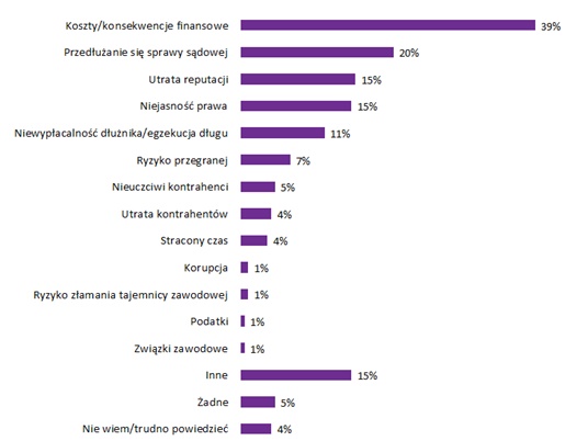 Ankietowani wskazali jednak kilka zagrożeń istotnych nawet dla dużych korporacji. Przeciągające się spory mogą np. opóźniać realizację projektów inwestycyjnych, a niedotrzymanie terminów może być związane z karami i kolejnymi procesami. Wszyscy badani zgodzili się, że groźne mogą być duże spory, w których ogromne odszkodowania lub brak możliwości odzyskania od wierzyciela znaczącej należności mogą zagrażać stabilności finansowej firmy.