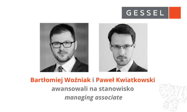 Dr Bartłomiej Woźniak, adwokat w zespole fuzji i przejęć kierowanym przez Macieja Kożuchowskiego oraz Paweł Kwiatkowski, adwokat w zespołach: postępowań sądowych oraz projektów specjalnych (risk & support), kierowanych przez Piotra Schramma, awansowali na stanowisko managing associate w kancelarii Gessel, Koziorowski sp.k.