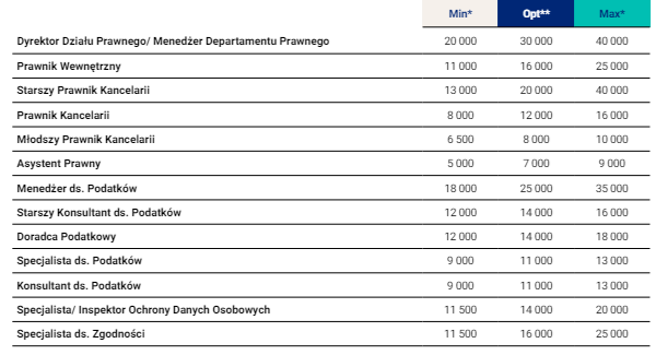 Wynagrodzenie uzależnione jest od poziomu doświadczenia, lokalizacji, profilu kancelarii bądź firmy oraz specjalizacji. *Miesięczne wynagrodzenie brutto na danym stanowisku (pełen etat).**Najczęściej oferowane wynagrodzenie na danym stanowisku. Źródło: „Raport płacowy 2023”, Hays Poland